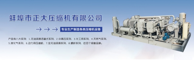蚌埠市正大压缩机有限公司是专业生产制造各类高、中、低压气体压缩机设备的企业。公司现拥有大型的生产制造车间,一批专业的高级技术工程师人员队伍,严格的产品检测设备,按照ISO9001:2000国际质量体系控制产品质量。产品有八大系列:1.无油润滑活塞式系列、2.中高压系列、3.化工用系列、4.天然气系列、5.液化气系列、6.动力用压缩机、7.全无油润滑系列、8.螺杆系列,近百个规格品种。产品排气量0.2-40m3/min,排气压力0.2-35MPa。所生产的空压机产品广泛适用于城市建设、石油化工,煤炭、地质、冶金、制药、液化气站、油气库码头等部门,可压缩:天然气、空气、氮气、煤气、二氟乙烷、二氧化碳、乙烯、丙烯、氯乙烯、二甲醚、液化气、矿井气、沼气、氧气、氢气、氨气、一氧化碳等各种特殊气体。业务遍及安徽蚌埠、柳州、湖南、河南、江苏、山东、四川等地。